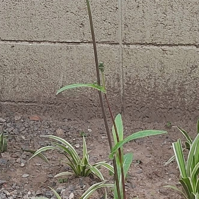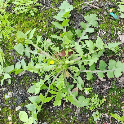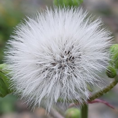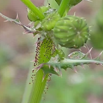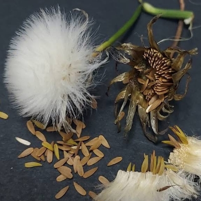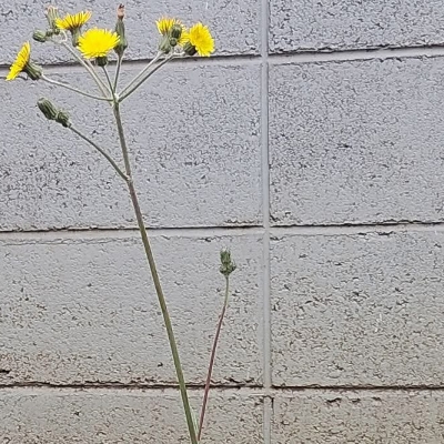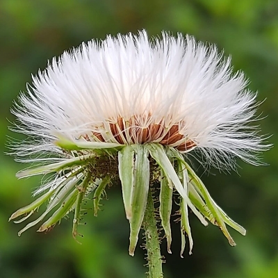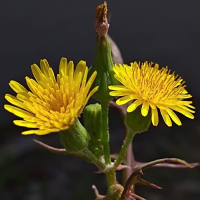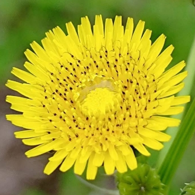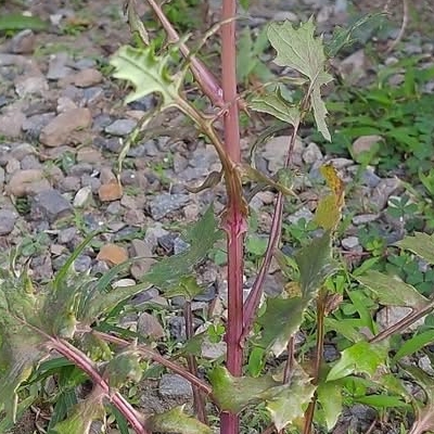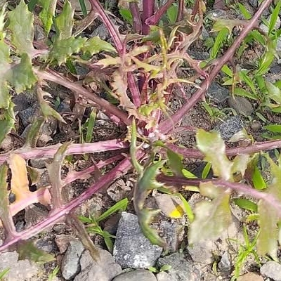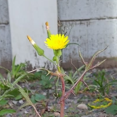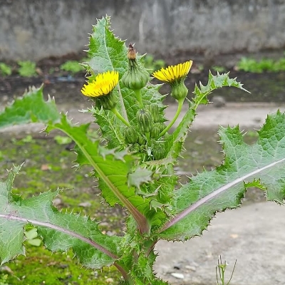 ●鬼苦苣菜(Sonchus asper、花葉滇苦菜) (歸化種;原生於亞洲北部至非洲北半部一帶;世界植物在線 POWO 附有照片(相符);台灣物種名錄標名鬼苦苣菜,別名苦苣菜,附有照片;維基百科標名花葉滇苦菜,別名鬼苦苣菜、斷續菊;草本;莖光滑;單葉互生,鋸齒緣;葉形多變,莖生葉葉基耳狀;頭狀花序,呈繖房狀排列,頭花梗長短不一,花序或呈鬆散狀;花冠黃色,多數舌狀花;總苞無毛或疏生軟質刺;瘦果倒披針形,扁平狀;冠毛白色,絲狀,集生呈毛球狀) | |