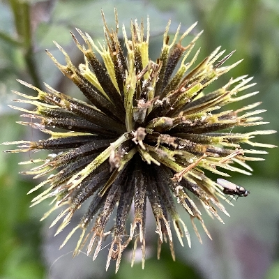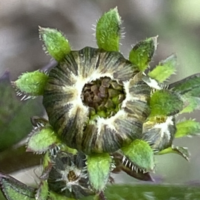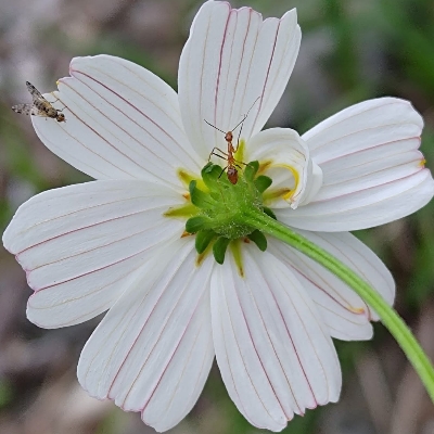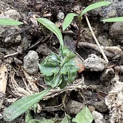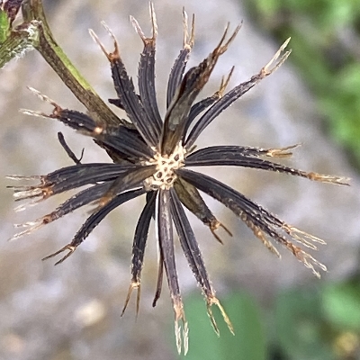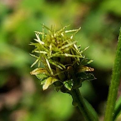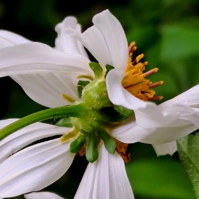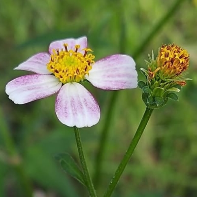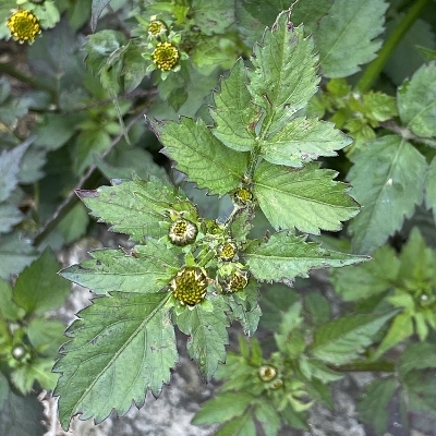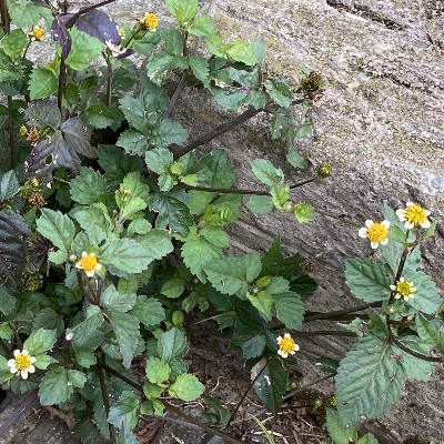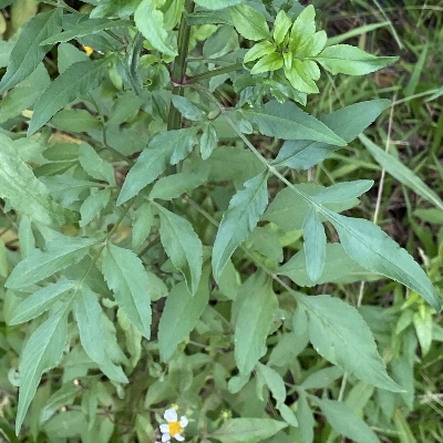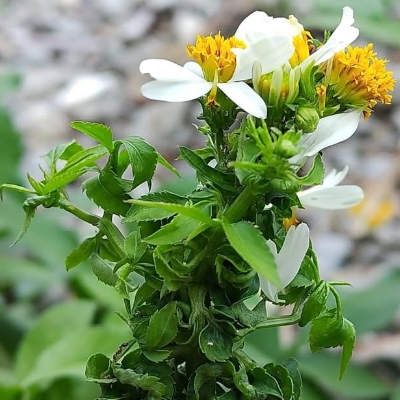 ●大花咸豐草(Bidens alba、Bidens pilosa var. radiata、大花鬼針草、大花婆婆針、大白花鬼針、同治草、黏人草) (歸化種(極具侵略性);原生於美洲;世界植物在線 POWO 標示 Bidens pilosa var. radiata = Bidens alba,皆為有效學名,附有照片(相符);台灣物種名錄將 Bidens pilosa var. radiata 標名大花咸豐草,別名大白花鬼針、同治草、大花鬼針草、大花婆婆針、黏人草,附有照片;維基百科將 Bidens alba 標名白花鬼針草,別名大花咸豐草、鬼針草,其種加詞 alba 意為白色的;多年生草本;多見三出複葉對生,偶見5~7枚小葉的奇數羽狀複葉,或二回羽狀複葉,鋸齒緣;頭狀花序,頂生或腋生,繖房狀排列;總苞多層,外層總苞片匙形,內層苞片披針形;外圍舌狀花白色,5~8枚(常見5枚或8枚,少見6枚或7枚);中間管狀花橘黃色;瘦果扁條狀,黑褐色,上端有2枚棘刺,具有細小倒刺,會勾粘衣物或動物的毛,藉由動物傳播種子) |