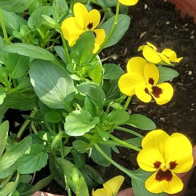 •三色堇(Viola tricolor、三色堇菜、蝴蝶花、人臉花) (栽培種;原生於歐洲;台灣物種名錄查無此學名及中文名;維基百科的三色堇照片,葉片倒披針形,花瓣倒長卵形;通常一朵花有藍、黃、白三色,故名三色堇) •野生堇菜(Viola arvensis) (歸化種) |