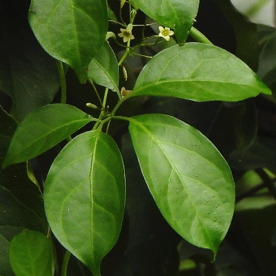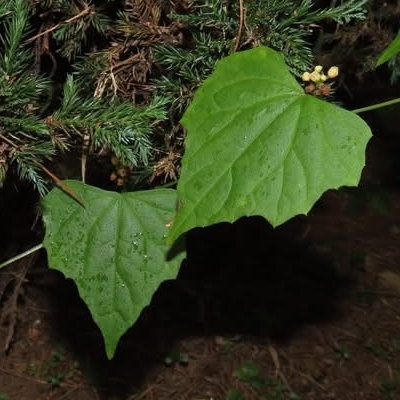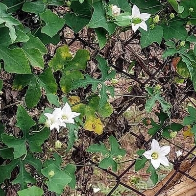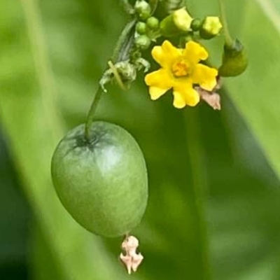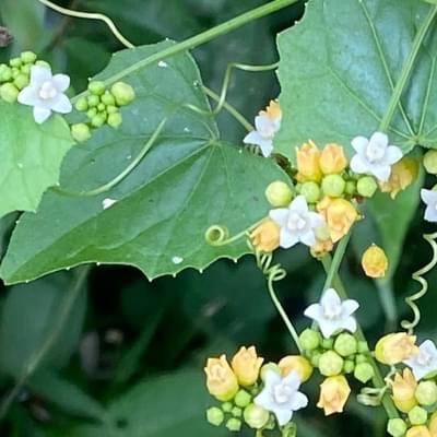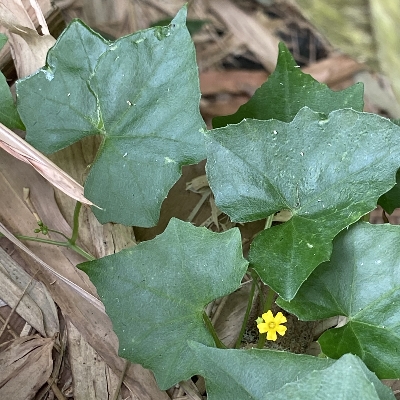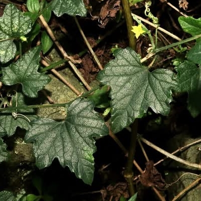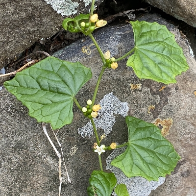 ●黑果馬㼎兒(Zehneria mucronata) (原生種;㼎讀勃,意為小瓜;單性花,雌雄同株或異株;葉卵狀三角形或淺裂掌狀,粗鋸齒緣,先端銳尖;花初開白色,後轉黃色;雄花腋生,多數;熟果近黑色,帶有香味) |