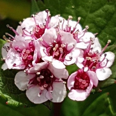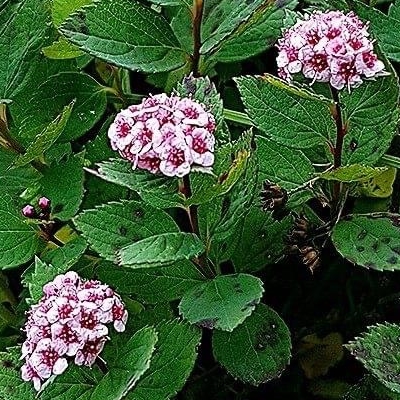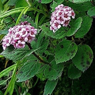formosana = Spiraea japonica var. formosana,皆為有效學名,標示原產於台灣,為台灣特有種;落葉灌木;小枝密被毛;單葉互生,長卵形至狹長橢圓形,重鋸齒緣,具短柄;葉背灰綠,被毛;聚繖花序,頂生;花瓣5枚,白色;雄蕊多數,花絲細長,花藥粉紅色;柱頭5枚) ●玉山繡線菊(Spiraea morrisonicola、新高山繡線菊) (台灣特有種;世界植物在線附有照片(相符);維基百科標名新高山繡線菊;落葉性灌木;植株低矮;全株光滑無毛(或幼時具短柔毛);單葉互生,闊卵形,鋸齒緣;花苞紅色;繖房花序,頂生,每個花序通常有花約10多朵;花瓣5枚,白色;雄蕊多數,花絲粉紅色,略長於花瓣,花心深桃紅色) |