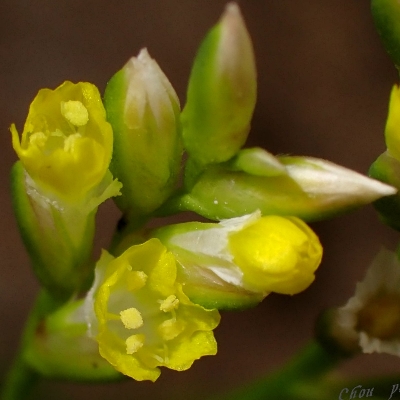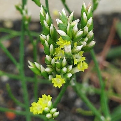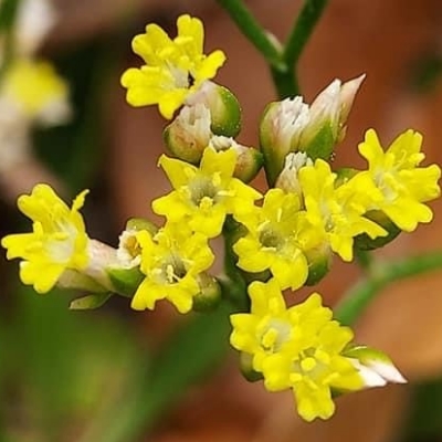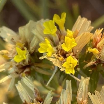 (蓯讀匆) ==台灣原生種== ●石蓯蓉(Limonium sinense、補血草、黃花磯松) (原生種;原生於台灣、中國大陸和越南;台灣物種名錄標名石蓯蓉,附有照片(相符);多年生草本;海濱植物;莖節甚短;單葉叢生,倒披針形,全緣,葉基或呈紅色;圓錐花序,頂生,花莖直立抽高狀;小花序穗狀;花瓣5枚,黃色;花萼漏斗狀,5淺裂,白色,宿存) |