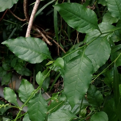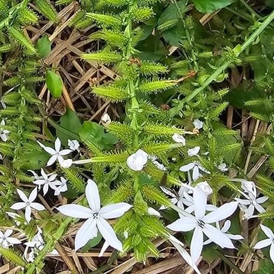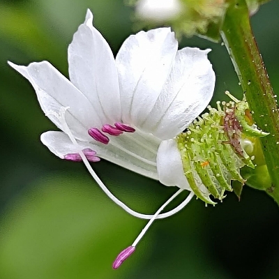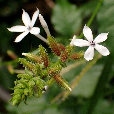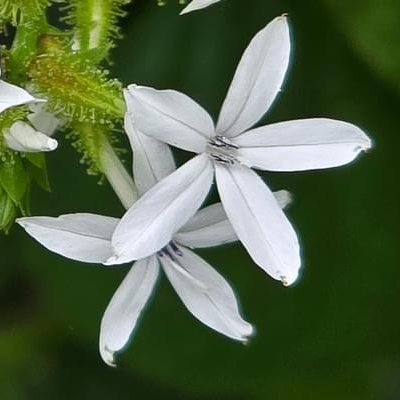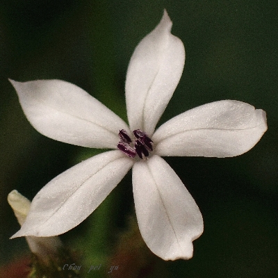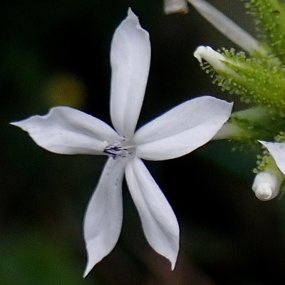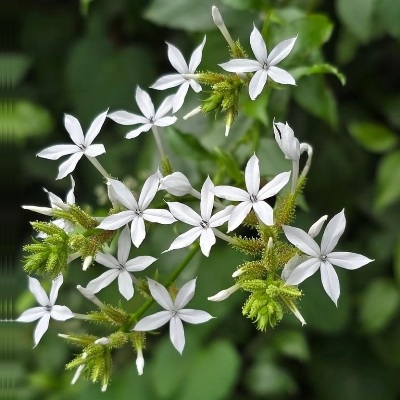 (Plumbago、白花丹屬、藍雪屬) ==台灣原生種== ●烏面馬(Plumbago zeylanica、白花丹、白花藤) (原生種;世界植物在線標示原生於台灣、中國大陸至非洲一帶,美洲和澳洲亦有原生分布;台灣物種名錄標名烏面馬,標示為歸化種;香港柴娃娃植物網標名白花丹;多年生蔓性半灌木;單葉互生,長卵形,全緣,基部下延成柄;總狀花序,頂生;花冠高杯狀;花瓣5枚,白色;雄蕊5枚,雌蕊柱頭5叉;花萼長筒狀,具5稜,密被腺毛,具黏性,可助種子傳播;花後,花萼宿存,胞果長卵形,包覆其中) |