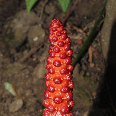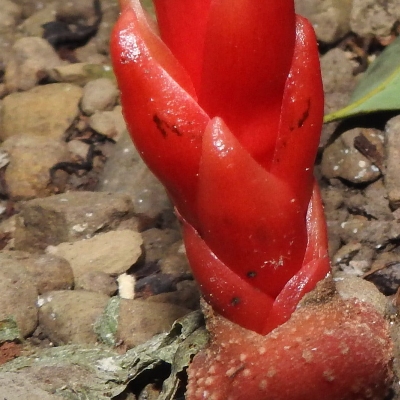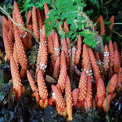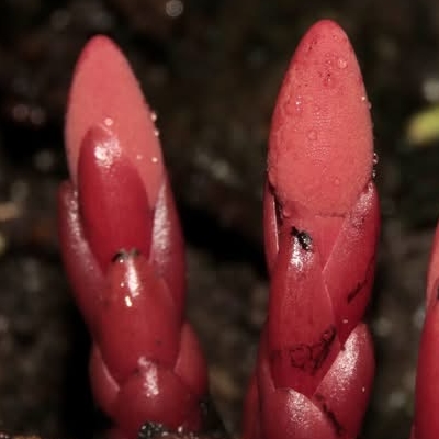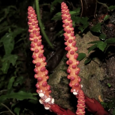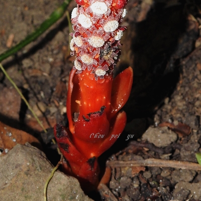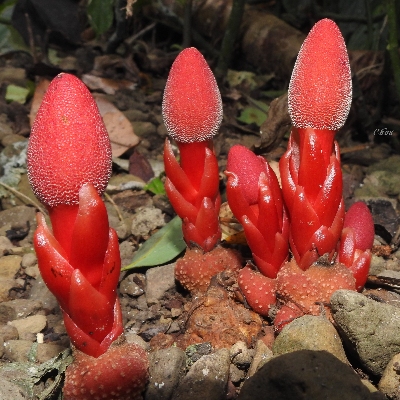 (Balanophora) ==台灣原生種== ●穗花蛇菰(Balanophora laxiflora) (原生種;原生於台灣、中國大陸至馬來西亞;寄生性草本;寄生於大樹幹的根部;全株紅色;雌雄異株;地下莖塊狀;莖直立;單葉互生,鱗片狀;穗狀花序,頂生;雌花序卵形至長卵形,無花被片;雄花序長柱狀,花被片約6枚(或多或少);花兒散發特殊味道,能吸引蒼蠅吸食,傳播花粉與授粉) |