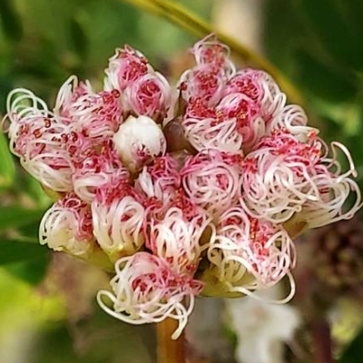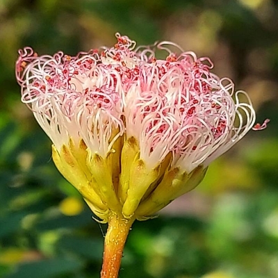 ●香水合歡(Calliandra brevipes、細葉合歡、細葉粉撲花、豔紅合歡) (栽培種;常綠灌木;二回羽狀複葉,羽片1對;小葉30~40對;花絲上面粉紅,下面白色) | |