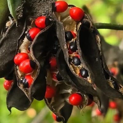 豆目 〉豆科 〉雞母珠屬 (Abrus、相思子屬) ==台灣原生種== ●雞母珠(Abrus precatorius、相思子、美人豆、紅豆、美麗相思子) (原生種;原生於中國大陸、非洲和澳洲的三角區域;木質纏繞性藤本;偶數羽狀複葉,互生;小葉8~20對,長橢圓形,全緣;總狀花序,腋生或頂生;花冠蝶形,粉紅色至 淡紫紅色(或白色);莢果短條狀,略扁,具喙,內含種子4~6顆;種子堅硬,一端紅色,一端黑色,紅多於黑,具光澤,形色像瓢蟲;種子含毒蛋白,屬劇毒;莖葉則無毒) |
