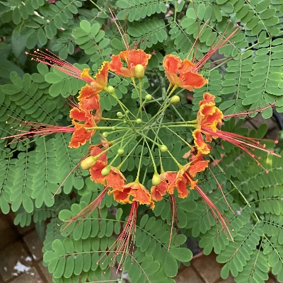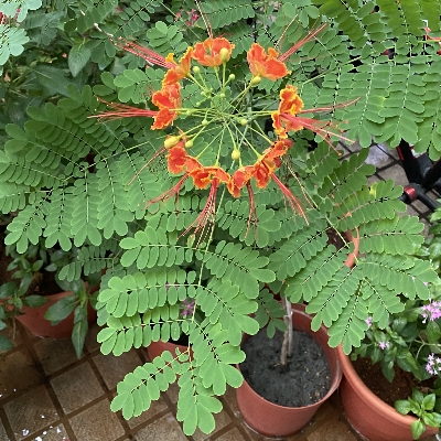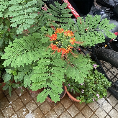 (Caesalpinia) ●蛺蝶花(Caesalpinia pulcherrima、紅蝴蝶、番蝴蝶、黃蝴蝶、金鳳花、洋金鳳) (栽培種;原生於中美洲;台灣物種名錄標名紅蝴蝶,別名洋金鳳、番蝴蝶、金鳳花、蛺蝶花、黃蝴蝶,附有照片;維基百科標名紅蝴蝶;花色並非只有紅色,至少還有黃色,別名紅蝴蝶或黃蝴蝶似乎不妥,可合稱為蛺蝶花;灌木;二回羽狀複葉,互生;總狀花序,頂生;莢果,刀形) |