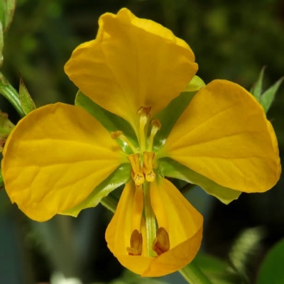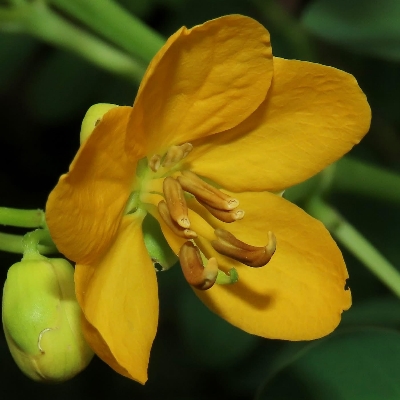 (Senna、決明屬) ==非台灣原生種== ●鐵刀木(Senna siamea) (歸化種;喬木,高可達10公尺;羽狀複葉,互生,小葉4~12對;花冠黃色,雄蕊10枚,3枚較長,4枚較短,3枚退化;莢果長刀形,長約20~30公分) ●翼柄決明(Senna alata、翅果鐵刀木、翅莢決明、翼軸決明) (歸化種;台灣物種名錄標名翼柄決明;香港柴娃娃植物網標名翅莢決明;株高約3~5公尺;羽狀複葉,互生;小葉8~12對;莢果具翼,12~18公分) •美麗決明(Senna spectabilis) (栽培種;台灣物種名錄查無此學名及中文名;株高約5公尺;羽狀複葉,互生,小葉6~15對,葉尾收尖;雄蕊10枚,7枚可孕,3枚退化) ●黃槐決明(Senna surattensis、黃槐) (歸化種;原生於印度附近一帶;台灣物種名錄標名黃槐;維基百科和香港柴娃娃植物網皆標名黃槐決明;小喬本;羽狀複葉,互生;小葉6~9對,橢圓形至長橢圓形;總狀花序,頂生;花冠黃色;莢果扁平,帶狀,長約10公分,先端具喙) |