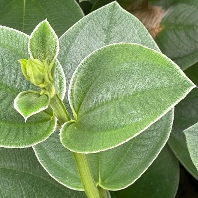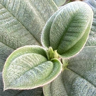 ●銀絨野牡丹(Pleroma heteromallum、Tibouchina heteromalla、銀葉野牡丹) (栽培種;世界植物在線 POWO 標示 Tibouchina heteromalla = Pleroma heteromallum,皆為有效學名,附有照片;中國植物智標銀葉野牡丹名,附有照片相符;台灣物種名錄查無此學名及中文名;常綠或落葉灌木;株高1~3公尺;莖條直立;葉面密被白色絨毛;花冠紫色) | |