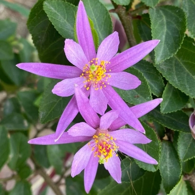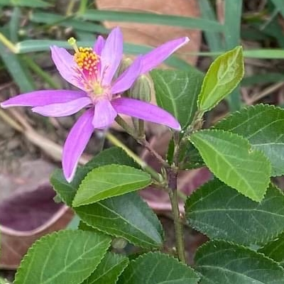 ●紫花捕魚木(Grewia occidentalis、紫花扁擔杆、睡蓮木、水蓮木) (栽培種;台灣物種名錄查無此學名及中文名;維基百科標名紫花扁擔杆;常綠灌木或小喬木,高可達4~5公尺;單葉互生,菱形至倒卵形,鋸齒緣;花腋生,粉紅色,花瓣5枚,花萼5枚,花瓣和花萼形色相似,全年開花;罕見結果) | |