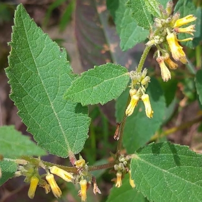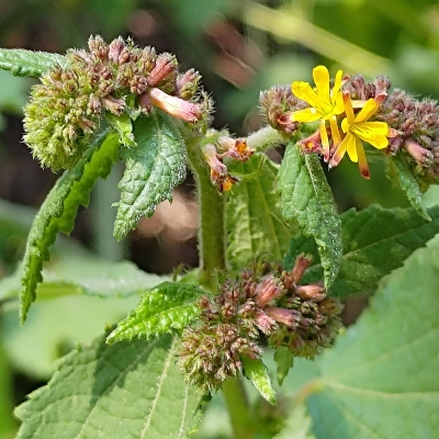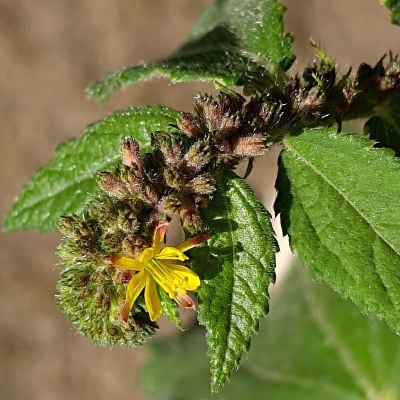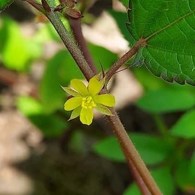 (桉:音讀案,意同案) ==台灣原生種== ●垂桉草(Triumfetta rhomboidea、菱葉黐頭婆、刺蒴麻、黃花虱母子) (原生種;原生於亞洲和非洲之熱帶和亞熱帶地區;垂桉之名從拉丁文trium 直譯而來;別名菱葉黐頭婆,黐讀吃,黏的意思;維基百科標名刺蒴麻;藥草界稱之為黃花虱母子;多年生草本或半灌木;單葉互生,葉形變化大,寬卵狀菱形、長卵形或橢圓形,或三淺裂,鋸齒緣,基出三脈;聚繖花序,排列成總狀或圓錐狀,腋生或頂生;花瓣5枚,黃色;萼片5枚,線形,與花瓣同色,先端紅色,有尖突;蒴果卵球形,表面具刺,能附著在人畜身上,藉由動物傳播種子) |