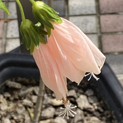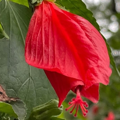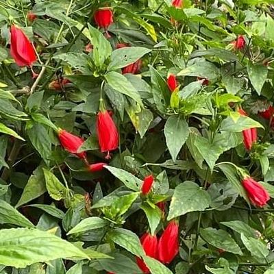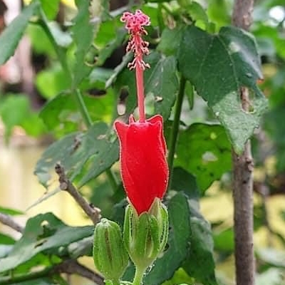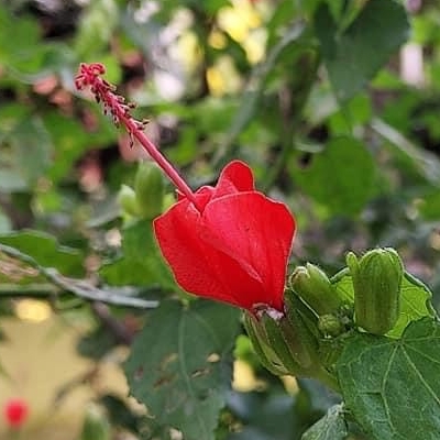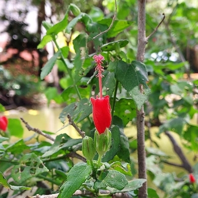 ●朝天槿(Malvaviscus arboreus var. drumnondii、小懸鈴花、小紅袍、沖天槿、小南美朱槿、美國朱槿) (香港柴娃娃植物網標名小懸鈴花;花冠紅色,朝上開放) |