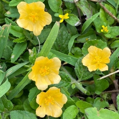 (原生種;原生於台灣、菲律賓、中國大陸至印度一帶;直立草本或半灌木,株高可達1公尺;莖、枝密被黏質星狀腺毛及長柔毛;單葉互生,心形至長卵心形,鋸齒緣,先端漸尖,長3~6公分,兩面均被黏質星狀柔毛;花序腋生,單生或成對,或數朵簇生於具葉的短枝上;花梗近中部具節;花瓣5枚,徑約1公分;雄蕊多數,雌蕊5叉;花萼密被星狀毛;蒴果近球形,直徑不到0.5公分,5瓣狀;種子上端無芒刺) ●澎湖金午時花(Sida cordata、Sida veronicifolia、長梗金午時花、長梗黃花稔) (原生種;原生於台灣、中國大陸至阿拉伯半島東南部;世界植物在線 POWO 標示 Sida veronicifolia = Sida cordata,皆為有效學名,附有照片;香港柴娃娃植物網標名長梗黃花稔;半灌木草本;匍匐或斜上生長;小枝纖細,被星狀毛並生長柔毛;單葉互生,心形至圓心形,鋸齒緣,長1~5公分,兩面被細毛;葉柄細長,長1~3公分;花序腋生,常單生或數朵成具葉的總狀花序;花梗纖細,長2~4公分(花後延長),中部以上具節,疏被星狀毛和長柔毛;花瓣5枚,黃色;雌蕊5叉;花萼5枚,長約0.5公分,疏被長柔毛;蒴果近球形,5瓣狀,種子上端無芒刺) •爪哇金午時花(Sida javensis) (原生種;原生於台灣、中南半島、印尼爪哇島、印度、非洲...等地;匍匐性半灌狀草本,株高可達1公尺;單葉互生,心形至近心形,長1~3公分(相當小,一側的鋸齒不到10個),上表面散生硬毛,下表面被星狀毛,葉柄長1~3公分,被星狀毛;花朵單生於葉腋,花梗細長;花瓣5枚,黃色,雌蕊5叉,下彎;蒴果近球狀,徑約3公分,成熟5瓣裂;成熟心皮上端具2芒刺) •短柄爪哇金午時花(Sida javensis subsp. expilosa) (原生種;亞種;匍匐性草本;單葉互生,心形,鋸齒緣;花腋生,單生,或短總狀花序,花冠黃色,花梗長7~15mm) |