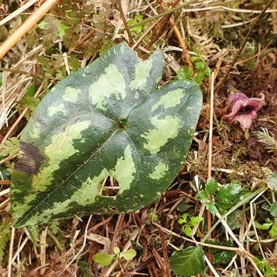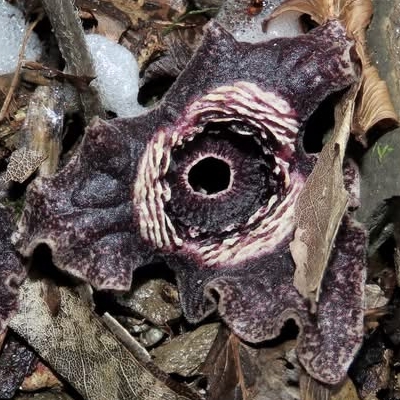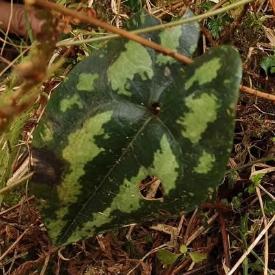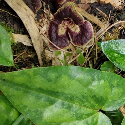 (Asarum) ==台灣原生種== ●大花細辛(Asarum macranthum、Asarum taitonense、Asarum albomaculatum、大屯細辛、白斑細辛) (台灣特有種;世界植物在線 POWO 標示 Asarum taitonense = Asarum macranthum,皆為有效學名;台灣物種名錄將 Asarum macranthum 標名大花細辛,將 Asarum taitonense 標名大屯細辛,將 Asarum albomaculatum 標名白斑細辛;多年生宿根性草本;根莖短;單葉互生,叢生,心形,上表面常具白斑,下表面紫色或葉脈呈紫色,具長柄;花朵單生於葉柄基部;花被紫色,合生呈三角漏斗狀,邊緣皺縮呈波浪狀;無花瓣;蒴果近球形) |