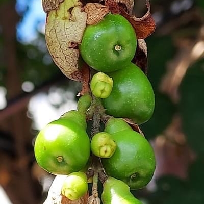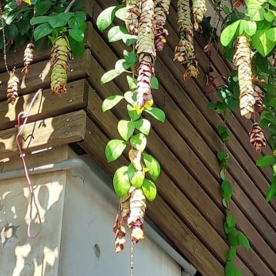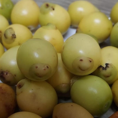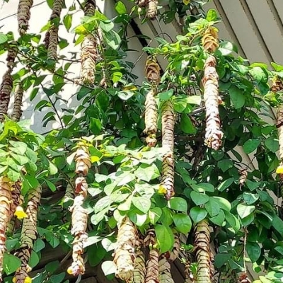 ●石梓(Gmelina chinensis) (栽培種;原生於中國大陸和中南半島東側(網路查詢有雲南石梓之別名,但原生地並不包含雲南);台灣物種名錄標名石梓;喬木;單葉對生,闊卵形至卵狀橢圓形,全緣,基芔三脈;聚繖花序組成頂生的圓錐花序;花瓣5枚,黃色帶橘色;核果倒卵形) | ||