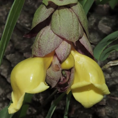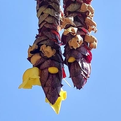 (Gmelina) ==非台灣原生種== ●菲律賓石梓(Gmelina philippensis、龍蝦花) (栽培種;原生於菲律賓和中南半島;台灣物種名錄標名菲律賓石梓,別名龍蝦花;木質藤本;單葉對生,倒卵形至橢圓形,或前端三淺裂;葉腋具有棘刺;聚繖花序組成總狀花序,頂生,花序懸垂,長可達15公分以上,有紫褐色的苞片鱗狀包覆;花冠黃色,通常於花序先端成對開放,像似龍蝦的一對大螯,故有龍蝦花之別名;核果倒卵形) |
