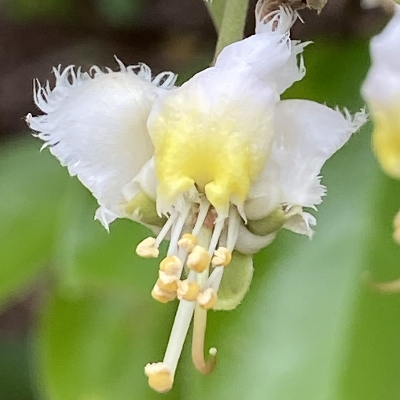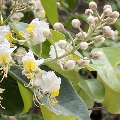 (Hiptage) ==台灣原生種== ●猿尾藤(Hiptage benghalensis) (原生種;原生於中國大陸、印度半島至印尼一帶;木質藤本;單葉對生,長橢圓形至長卵狀披針形,全緣,具短柄;新葉常呈紅色;總狀花序,腋生或頂生;花瓣5枚,黃白色,瓣緣流蘇狀;雄蕊兩型,1長9短;翅果,具3枚革質翼,可藉由風力傳播繁衍,內含種子1枚,球形) |
